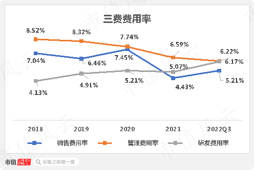 从三费费用率来看,公司直销模式下稳定的客户关系使得销售费用率在走低,而公司持续在研发上发力,2022年前三季度为6.1%,较2018年提升了2个百分点,值得肯定。