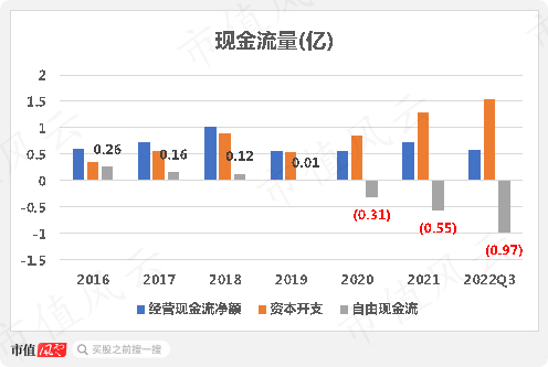 2016-22年前三个季度,公司通过经营活动共产生了4.8亿现金流,支出6亿资本开支,最终自由现金流净流出1.2亿。尤其公司2020年后开始发展新业务,现金流不断吃紧。