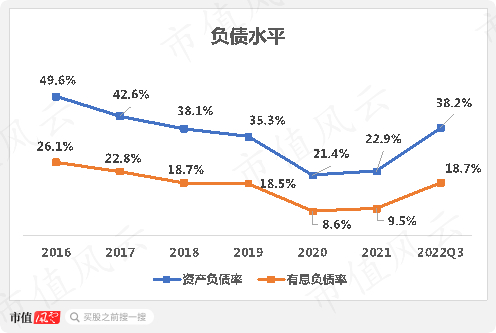 公司上市后负债水平先降后升,2022年前三季度末高达38.2%。有息负债率走势一致,同期18.7%。