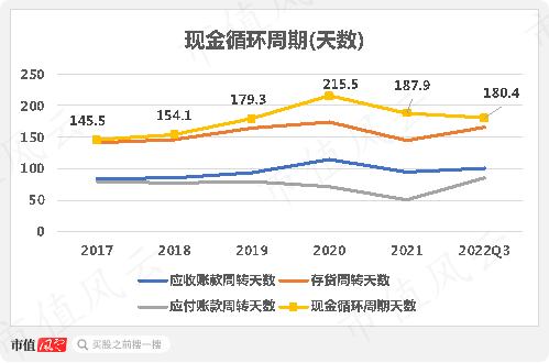 近年来公司现金循环周期天数呈先升后降的趋势,2022年前三季度为180天,现金流有一定压力。