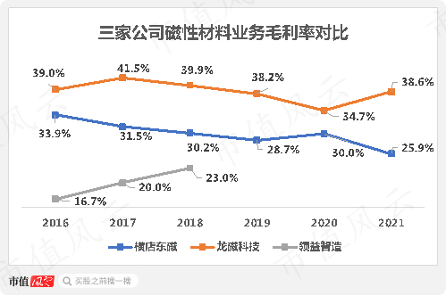 对比同行业三家磁性业务毛利率,近年来公司常年在35%以上,远超其余两家。不仅上市前其毛利率是领益智造(002600.SZ)的两倍,一路发展下来到2021年仍超龙头横店东磁12个百分点。