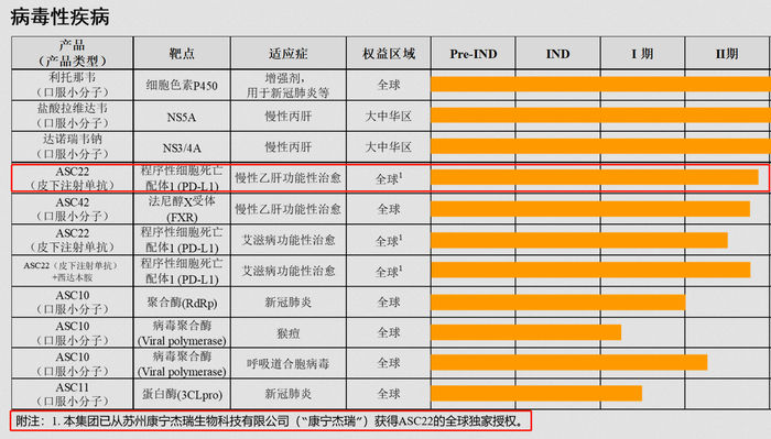 值得一提的是,歌礼制药的ASC22是2021年从康宁杰瑞引进的管线,相关管线在康宁杰瑞的代号为KN035。ASC22(KN035)是康宁杰瑞开发的全球首个可实现皮下注射给药的PD-L1抗体药物,其肿瘤适应症由康宁杰瑞生自行开发,并已于2021年经国家药品监督管理局批准上市。而歌礼制药则拥有ASC22(KN035)用于治疗病毒性疾病的开发和商业化的全球独家权益。