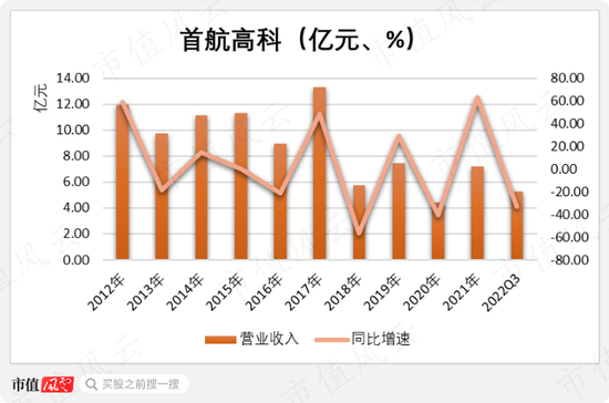 2012年上市后,首航高科营业收入起起伏伏,2021年实现7.19亿元,只有十年前的60%。