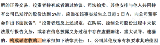 根据最新的《公司章程》,股东、投资者持有公司已发行股份达到2%时,应当在该事实发生之日起3日内,向公司董事会作出书面报告,否则构成恶意收购。