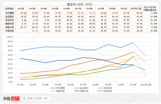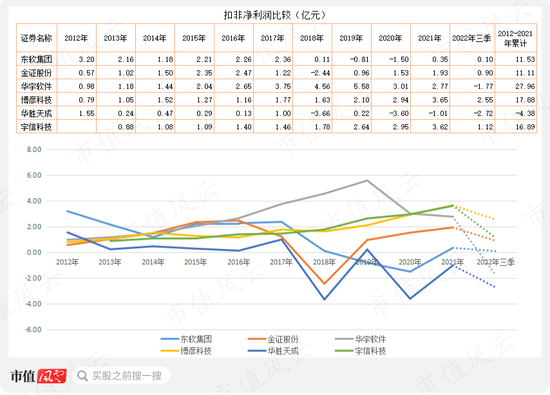 2012-2021年,营收规模较大的东软集团、金证股份,扣非净利润累计均不到12亿元。