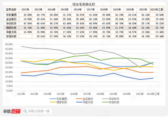 盈利能力方面,6家公司的综合毛利率都呈现下降趋势,尤其是毛利率较高的华宇软件、宇信科技下降更为明显。而金证股份、华胜天成毛利率较低,但仍然有所下降。