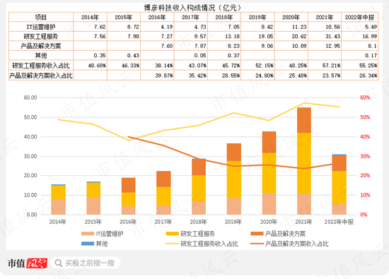 其中,研发工程服务是第一大业务,2021年突破31亿元,达31.43亿元;产品及解决方案是第二大业务,2021年收入接近13亿元;企业应用及IT服务最少,2021年为10.56亿元,同比有所下滑。
