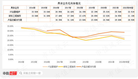 从成本上看,产品及解决方案应该是边际成本递减的业务。因此,其毛利率相对较高一些,2022年中报接近29%,而另外两块业务均在25%上下。