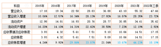 2021年应收账款增速首次达44%,今年前三季度应收账款环比增长18%,虽然低于同期营业收入增速,但远高于流动资产增速。