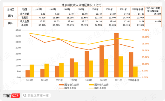 2020年以来,国内与国外业务的收入规模大致是2:1,前者的毛利率低于后者。