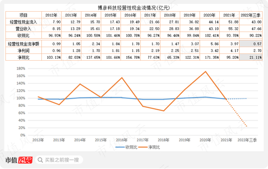 2012至2021年,博彦科技收现比基本在100%上下,说明经营性现金流入与营业收入是相匹配的。