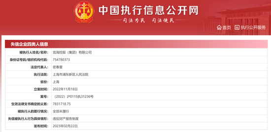 2月22日,据中国执行信息公开网,览海控股和其法定代表人密春雷因未按执行通知书指定的期间履行生效法律文书确定的给付义务,被采取限制消费措施。
