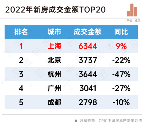 CRIC数据显示,2022年全年,全国百城成交下跌40%。在全国城市规模普降的同时,2022年上海新房成交金额6344亿元,同比增长9%,是成交金额唯一出现增长的城市。