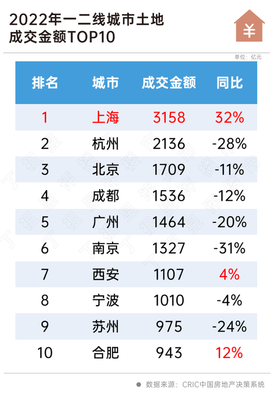 2022年,上海全年土地成交金额3158亿元,列一二线城市成交金额TOP10城市榜首,同比上涨32%,是少数出现同比上涨的城市之一。