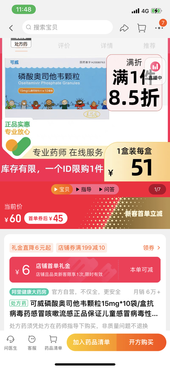 甲流侵袭,流感“神药”奥司他韦再度被推向风口,出现热卖甚至紧缺的情况。红星资本局查询阿里健康大药房发现,15mg*10袋/盒的磷酸奥司他韦颗粒标价60元,月销量6万+,另一规格销量也达1万+;75mg*6粒/盒的磷酸奥司他韦胶囊标价85元,月销1万+;磷酸奥司他韦干混悬剂价格为109元/瓶,销量2000+。