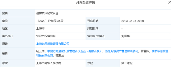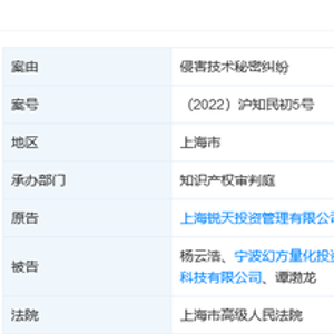 天眼查信息显示,一份案号为(2022)沪知民初5号的侵害技术秘密纠纷案件于今年2月8日开庭,原告为锐天投资,被告为杨云浩、宁波幻方量化、九章资产、苗春晖、积幂公司和谭渤龙等。