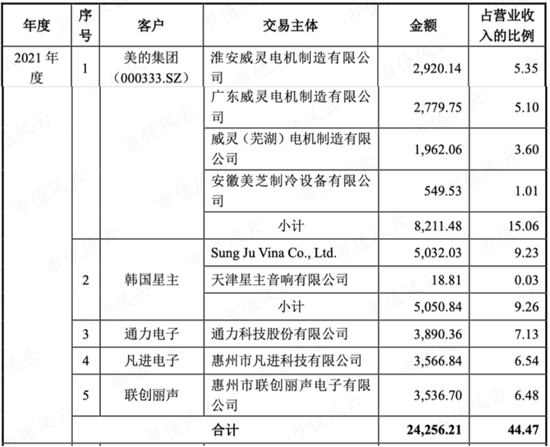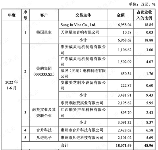 中科磁业前五大客户为韩国星主、美的、融贤实业、通力电子等。