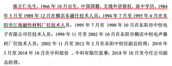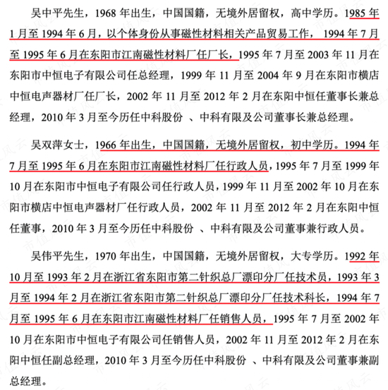 中科磁业两位创始人吴中平、吴伟平分别为高中、大专学历,而对比中科三环王震西、宁波韵升竺韵德和金力永磁蔡报贵等,都是名牌大学的工科生。