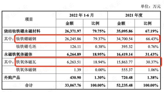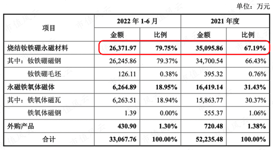 2019年-2022年上半年,中科磁业烧结钕铁硼永磁材料收入分别为1.60亿、2.25亿、3.50亿和2.63亿,占当期总营业收入比例为63%、61%、67%和79%。
