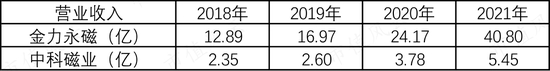 目前金力永磁的收入规模已经是中科磁业的7倍多:2021年金力永磁营业收入为40.80亿,中科磁业才5.45亿。