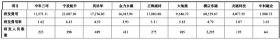 而且中科磁业的研发投入比例仅为3.65%,为行业可比公司排名倒数第二。