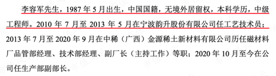 (4)李荣军以前是宁波韵升的工艺技术员,2020年10月才加入公司;