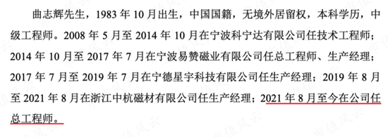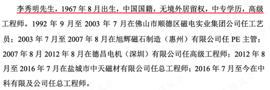 中科磁业两个核心技术人员黄益红和李荣军,分别是从横店东磁、宁波韵升出来的,而李秀明以前在的德昌电机也是做微电机的,因此相应我们可以看到下游客户也是消费电子和家电,并没有新能源汽车方面从业的核心技术人员。