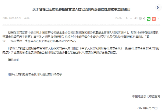 据这份《关于督促已注销私募基金管理人登记的机构妥善处理后续事宜的通知》,北京证监局督促已注销私募机构采取行动:及时主动注销企业登记或变更机构名称及经营范围,不得再以“基金”“基金管理”字样或者近似名称进行私募基金业务活动。