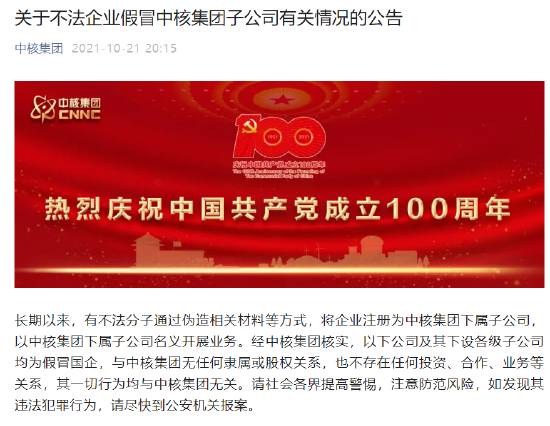 正是这家宣称股东方为中核集团的机构,在2021年10月就被中核集团公开“打假”,表示系假冒国企。
