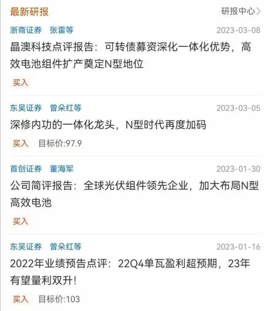 2023年1月16日,东吴证券分析师给出“买入”评级,目标价103元;3月5日,东吴证券分析师再次给出“买入”评级,目标价97.9元。然而,这两份研报发布后,晶澳科技股价震荡下行,买入的投资者大概率亏损。
