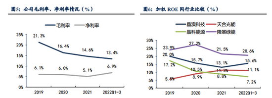 不过,在盈利能力方面,晶澳科技稍有逊色。2019年至2022年前三季度,晶澳科技的毛利率从21.3%整体下降至13.4%。同期,公司加权ROE从20%先下降至13.1%,紧接着反弹至15.6%,仅次于隆基绿能20.6%的加权ROE。