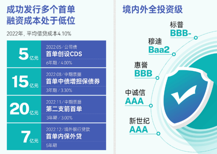 基于良好的债务结构和现金储备,龙湖已连续7年“三道红线”稳居绿档,为少有的仍获全投资级评级房企:标普(BBB-)、穆迪(Baa2)、惠誉(BBB),平均借贷成本进一步下降至4.10%,持续保持低位。