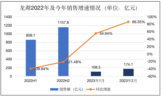 对于龙湖来说,2022年实现全口销售2015.9亿元同比有所下滑,但全年表现显著强于克而瑞百强房企42%的降幅。而今年开年来复苏势头强劲,在去年低基数下,1月、2月的销售同比增长高达54.94%、86.35%,即使相较于调整前的2021年,2月份销售额也同比增长10.4%,基本重回正轨。