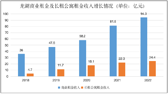 商业投资航道方面,截止去年底,龙湖商业在全国32座高能级城市累计获取了139个项目,加上2022年新增运营的15座(含轻资产三座,如龙湖杭州吾角天街等),已运营商场达76座。在营商场建筑面积722万平米,整体出租率达到93.9%,全年实现租金收入94.3亿元,过去5年实现复合增长达27%。2023年,龙湖预计开业5座重资产天街以及6座轻资产商业项目,保持过往每年开业的节奏。