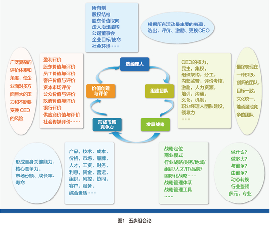 “五步组合论”的内容分别为:选经理人、组建团队、发展战略、形成市场竞争力、价值创造与评价,以此形成从人到事的循环(见图1)。