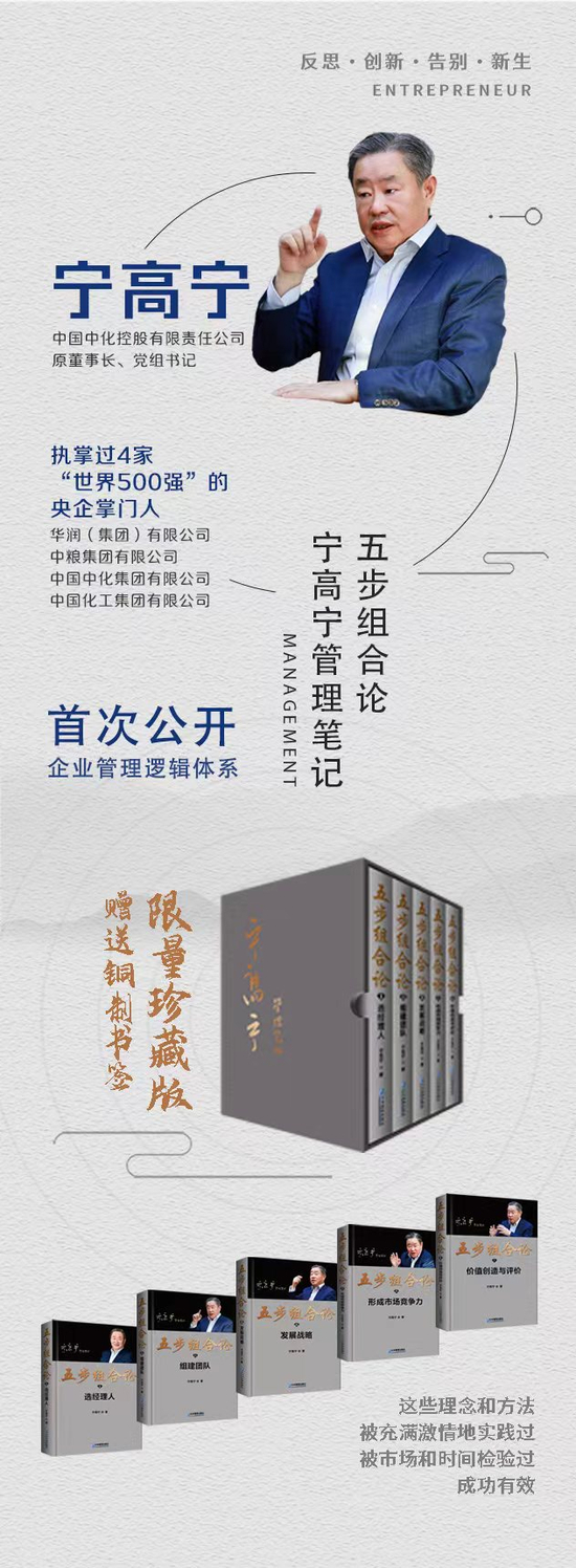 近期,企业管理出版社出版了“宁高宁管理笔记”丛书之一的《五步组合论》,宁高宁在自序中这样写道:“看一家企业要看他的成长过程,特别是当你看到在这个过程中他一会儿天真幼稚、一会儿跌跌撞撞,可他还顽强地跑了很远,这个过程就有一些启发。我参与过的华润、中粮、中化和中国化工以及后来两家整合的中国中化,这些公司在战略上实现了转型升级,市场竞争力增强,盈利能力也提高了,而且还在持续进步。我也被善意地贴上了一个执掌过4家世界500强企业的标签。”