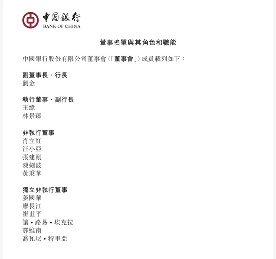 中国银行在H股公告中还披露了最新的董事会名单:目前中行高管是“一正两副”的配置,分别是行长刘金,副行长王纬和林景臻。而按照此前的常规架构,该行很可能需要补位副行长。