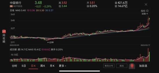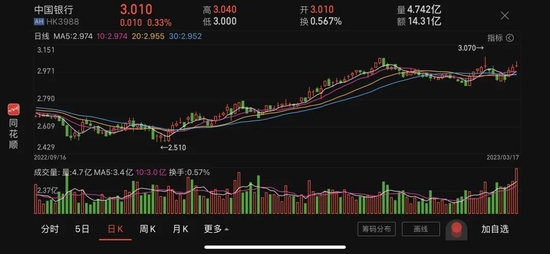 截至3月17日收盘,中国银行A股报收3.48元/股,市值为9552亿元;港股报收3.01港元/股,市值为8861亿港元。
