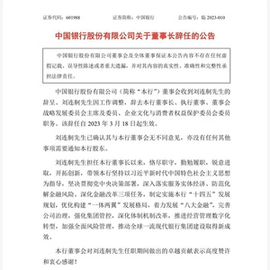 3月19日,中国银行在A股和港股均发布公告,董事会收到刘连舸的辞呈。刘连舸因工作调整,辞去本行董事长、执行董事、董事会战略发展委员会主席及委员、企业文化与消费者权益保护委员会委员职务。该辞任自2023年3月18日起生效。