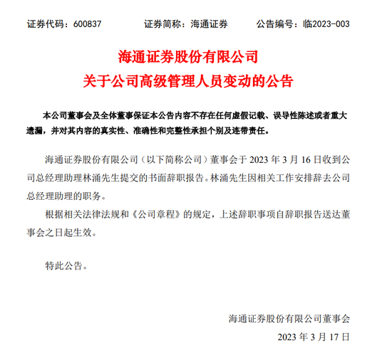 据公告披露,海通证券总经理助理林涌,因相关工作安排,于2023年3月16日辞任,即日生效。