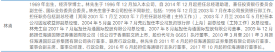 早在上个世纪,林涌便加入了海通证券,在投行业务部门和固收业务部门长期担任管理工作。2014年12月起,他出任海通证券总裁助理,兼任投资银行委员会副主任,国际业务委员会委员,并由此出现在高管名单中。