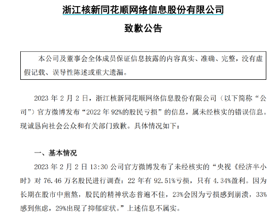 次日,同花顺便发布公告致歉,称“2022年逾92%的股民亏损”属未经核实的错误信息。