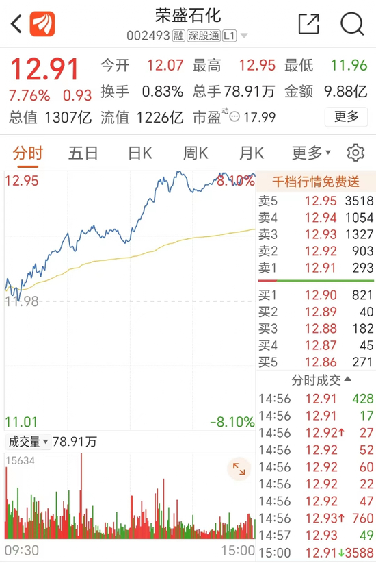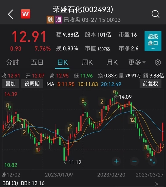 3月27日,荣盛石化大涨7.76%,以12.91元收盘,总市值为1307亿元。