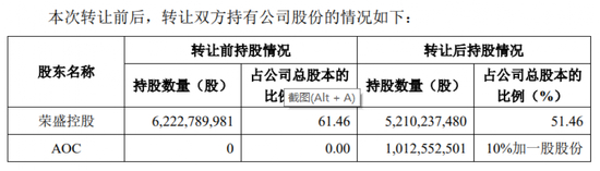 转让完成后,AOC持有荣盛石化10%股权加一股股份。