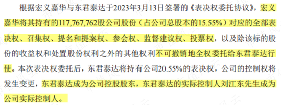 委托完成后,上市公司控股股东由宏义嘉华变为东君泰达,实控人由刘峙宏变为刘江东。