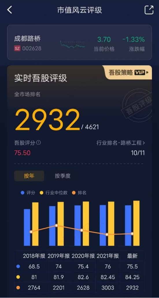 翻开吾股评级,全市场2932,位列中游水平;但全行业10/11,接近吊车尾。