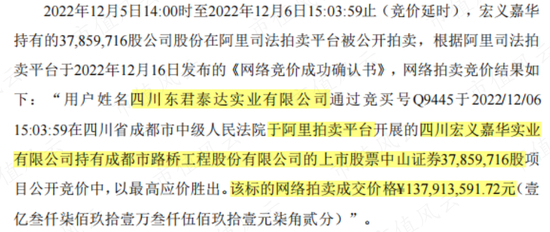 2023年3月23日,宏义嘉华因第三方债务担保问题,所持成都路桥5,947.9万股(占总股本的7.86%)被轮候冻结。