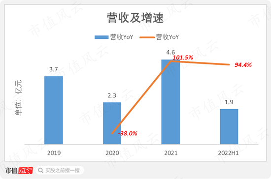 然而,公司迅速恢复了成长性。2021年,营收4.6亿元,同比增102%,2022年上半年同比增94%。