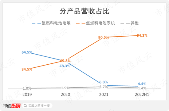 2021年,电池系统和电堆的营收占比分别为91%和6%。
