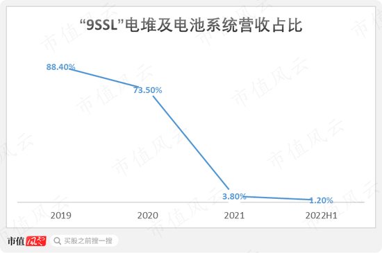 2019-2020年,“9SSL”电堆及相关电池系统的营收占比,分别高达88%和74%,自2021年起大幅跌至个位数。